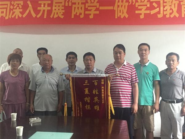 7月10日上午,界首市公司幫扶結(jié)對(duì)及秸稈禁燒工作責(zé)任區(qū)的界首市光武鎮(zhèn)李廟王行政村兩委一行8人,為界首市公司送來一面上書“百姓英雄 三夏楷?!钡腻\旗。