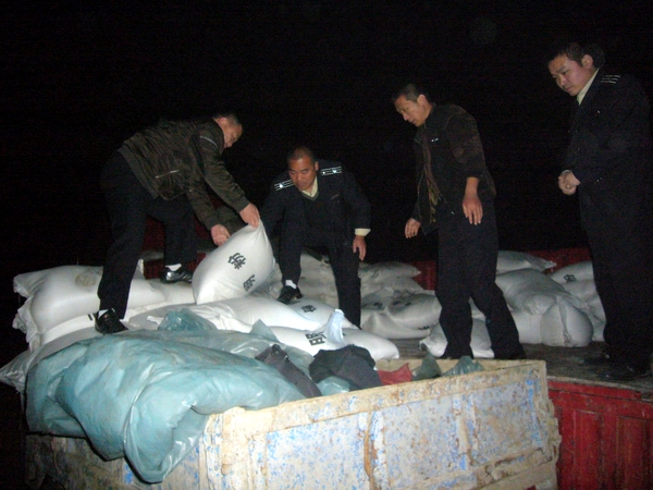 當(dāng)日夜,市鹽務(wù)局鹽政科接群眾舉報,稱有人在聞集鎮(zhèn)兩河口附近交易工業(yè)鹽。潁泉鹽政聯(lián)系聞集派出所協(xié)助。在聞集鎮(zhèn)兩河口附近的河壩上,執(zhí)法人員發(fā)現(xiàn)有人正在從贛籍紅色解放牌大貨車上往機動三輪車上卸白色袋裝物。執(zhí)法人員控制了現(xiàn)場人員和車輛,經(jīng)清點貨車上載有標(biāo)注“元明粉”的白色塑編袋鹽產(chǎn)品共計360包,約18噸,鹽產(chǎn)品經(jīng)現(xiàn)場碘試劑測試不含碘。