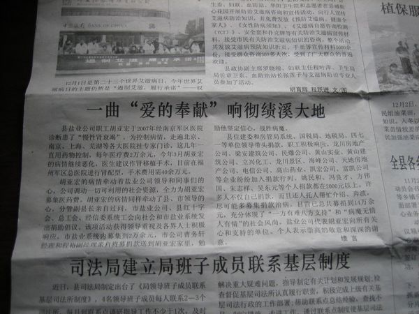 縣鹽業(yè)公司職工胡亞宏于2007年經南京軍區(qū)醫(yī)院診斷患了“慢性腎衰竭”,為控制病情,走遍北京、南京、上海、蕪湖等各大醫(yī)院掛專家門診,這幾年一直用藥物控制,每年醫(yī)療費2萬余元;今年3月胡亞宏病情惡化,醫(yī)生建議需作腎移植手術,目前在福州軍區(qū)總醫(yī)院進行腎配型,手術費用大約40余萬元。
